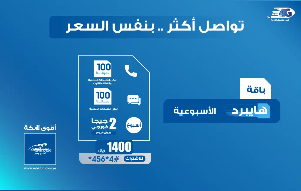 يسر إدارة سبأفون الإعلان عن باقة هايبرد الأسبوعية بحلتها الجديدة والمتمثلة في الباقات التالية: