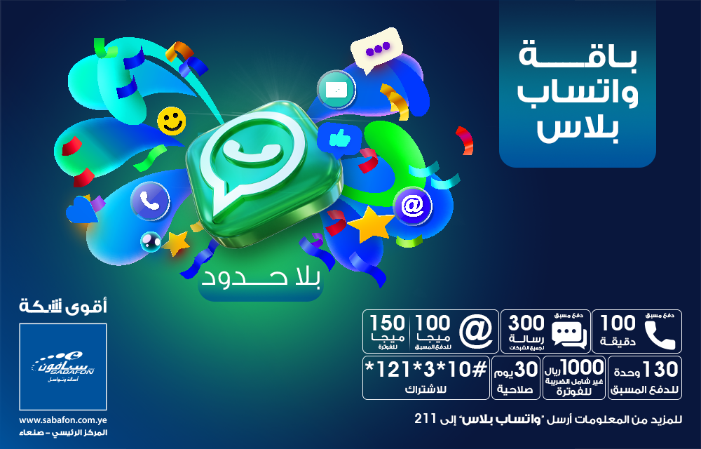 دشنت سبأفون باقة جديدة “واتساب بلاس WhatsApp Plus” حيث يستطيع المشترك الاشتراك بالباقة و مشاركة الفيديوهات والصور والملفات والمقاطع الصوتية أو ببساطة محادثة أصدقائك، وذلك خلال فترة اشتراك لمدة 30 يوم. كما تحتوي الباقة على إضافات أخرى مجانية لخطوط الفوترة والدفع المسبق حسب الجدول الآتي: