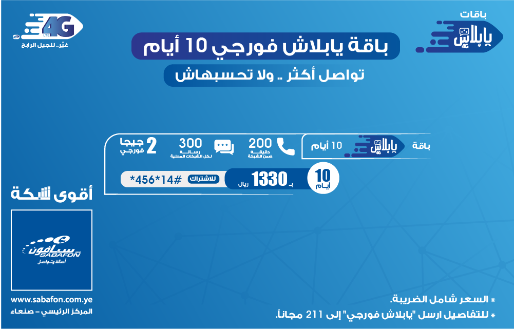 يسر إدارة سبأفون الإعلان عن باقة يابلاش فورجي 10 ايام بحلتها الجديدة والمتمثلة في الباقات التالية: